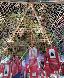 Inside the pyramid are the voices of real women. Real stories they've written. These words hang on red threads, suspended in the space, so when the viewer walks through, they are literally surrounded by women's lived experience.